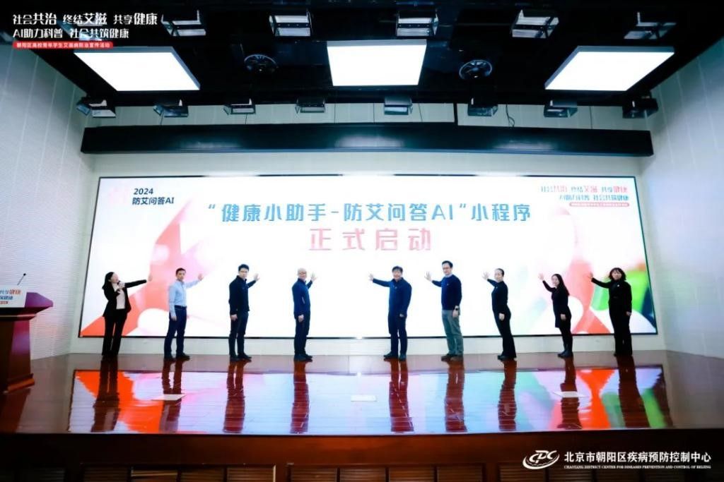 朝阳区疾控中心党总支副书记刘英杰介绍了由朝阳疾控与公司合作开发的“健康小助手-防艾问答AI”小程序的具体内容,并由王丽娟科长与员工针对小程序开发的目的和使用方法进行了互动。公司红丝带志愿团代表徐冰同学发言后,与会嘉宾共同上台启动“健康小助手-防艾问答AI”小程序。
